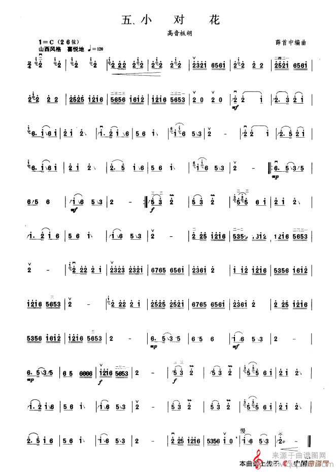 曲谱图网为您提供小对花简谱(小对花 板胡曲集第三级 高音板胡演奏简谱)找谱子,就上曲谱图网。