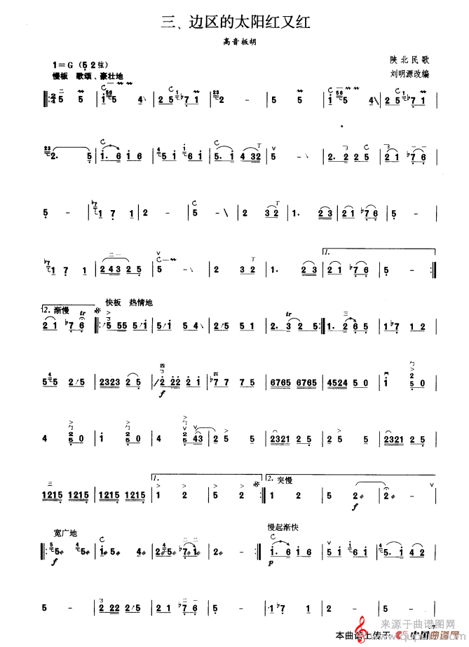 曲谱图网为您提供边区的太阳红又红简谱(边区的太阳红又红 板胡曲集第三级 高音板胡演奏曲谱)找谱子,就上曲谱图网。