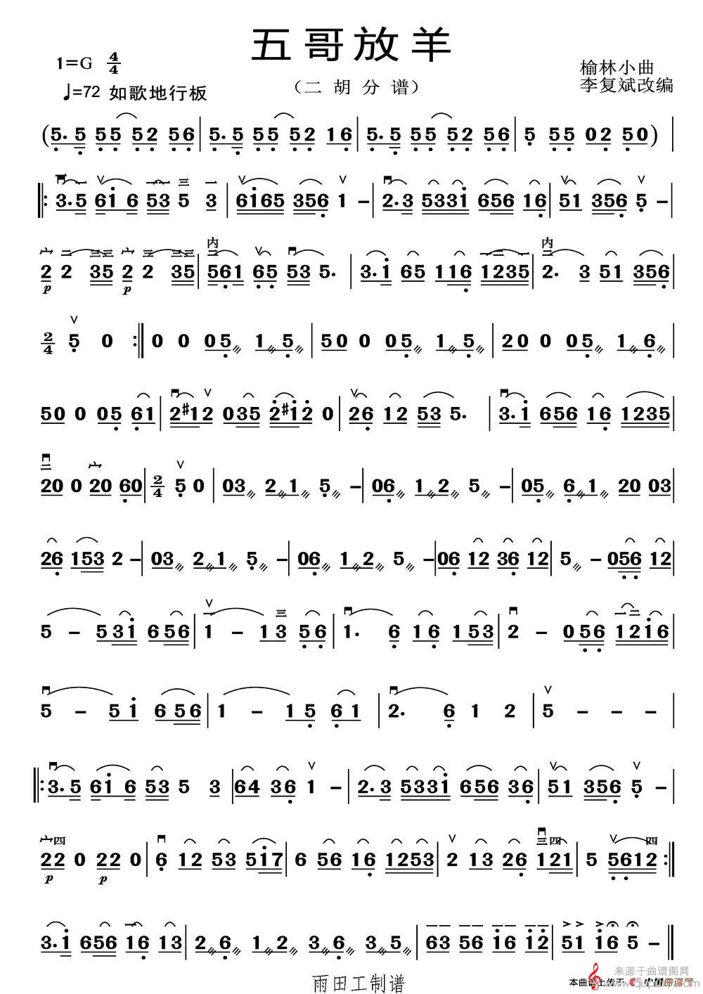 曲谱图网为您提供五哥放羊(五哥放羊二胡演奏歌曲分谱)找谱子,就上曲谱图网。