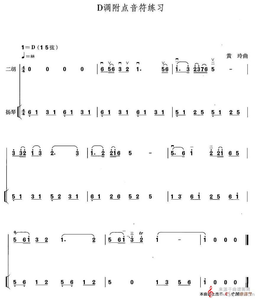 D调附点音符练习简谱(D调附点音符练习扬琴乐器伴奏歌曲谱)