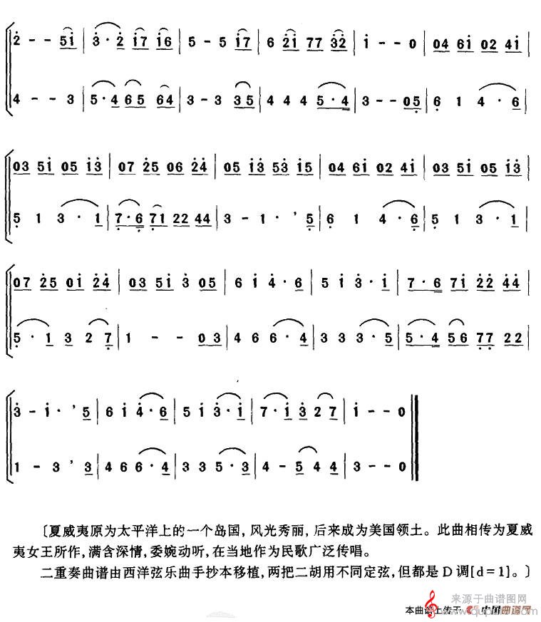 曲谱图网为您提供别了,夏威夷(别了,夏威夷二胡二重奏民乐歌曲版)找谱子,就上曲谱图网。