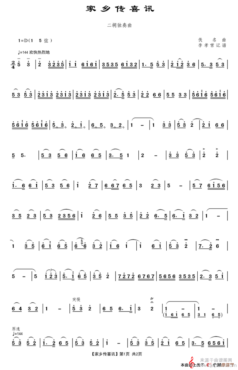 曲谱图网为您提供家乡传喜讯简谱(家乡传喜讯坠胡板胡演奏歌曲版)找谱子,就上曲谱图网。