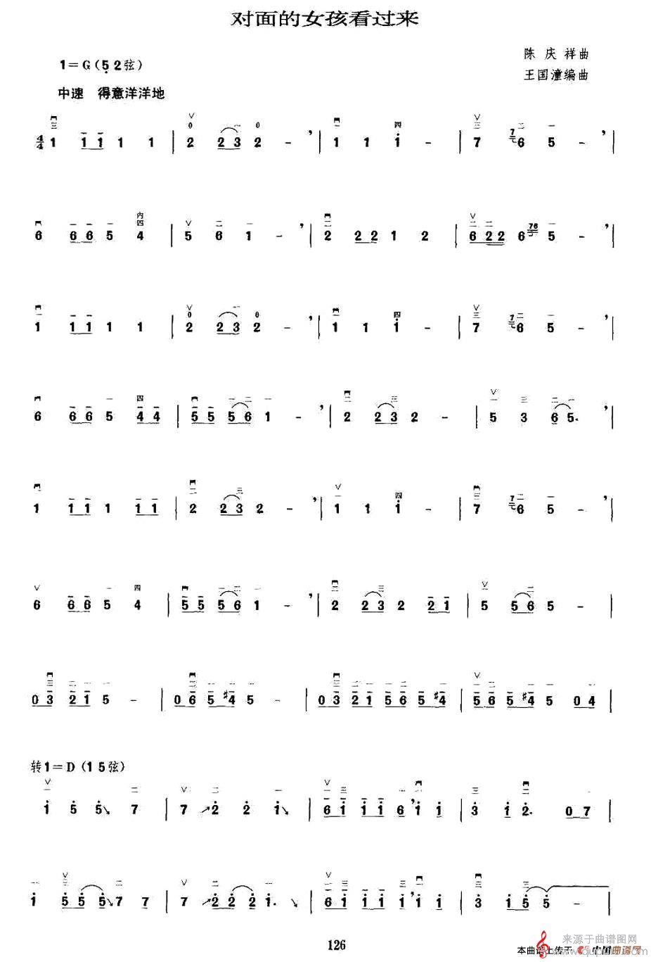 对面的女孩看过来简谱(歌词歌曲歌谱胡琴谱陈庆祥作曲)