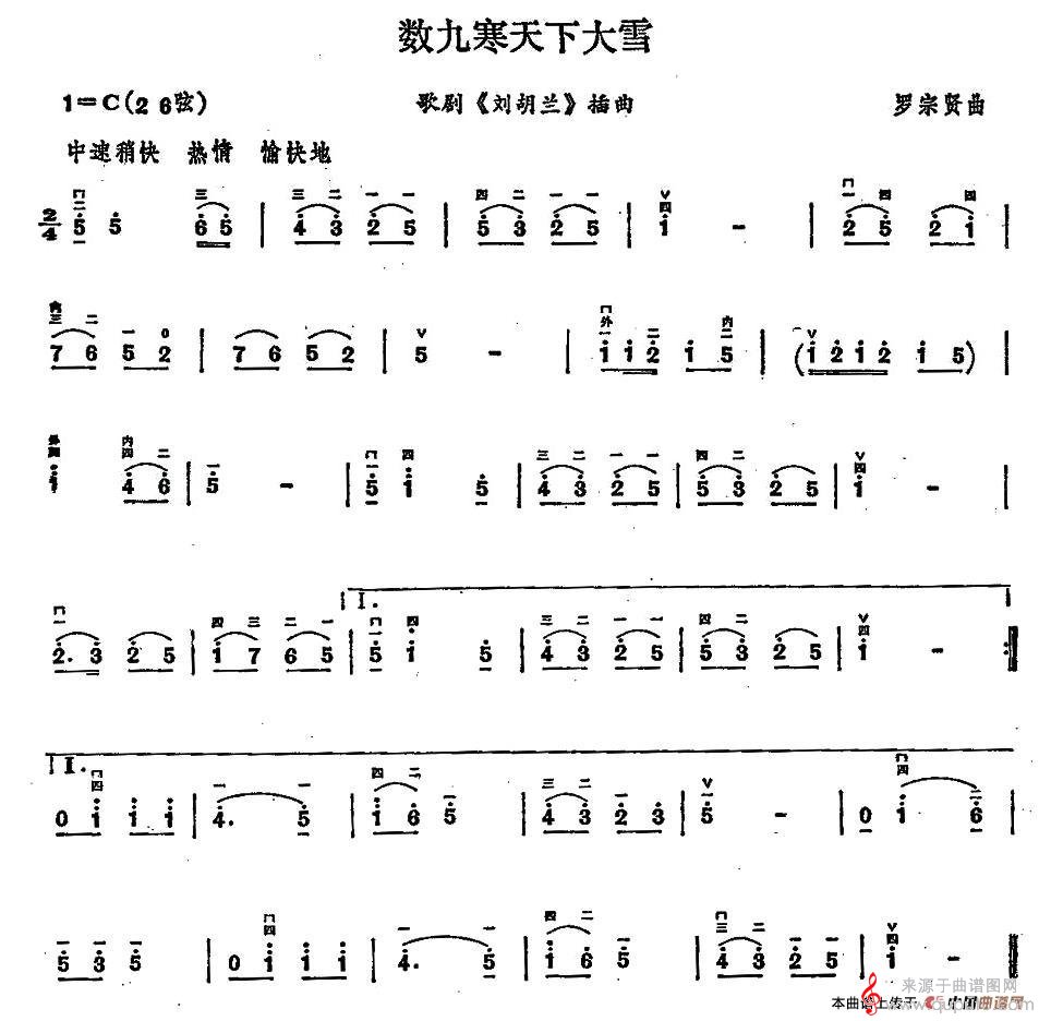 曲谱图网为您提供胡琴谱数九寒天下大雪(简谱曲谱歌剧《刘胡兰》插曲)找谱子,就上曲谱图网。