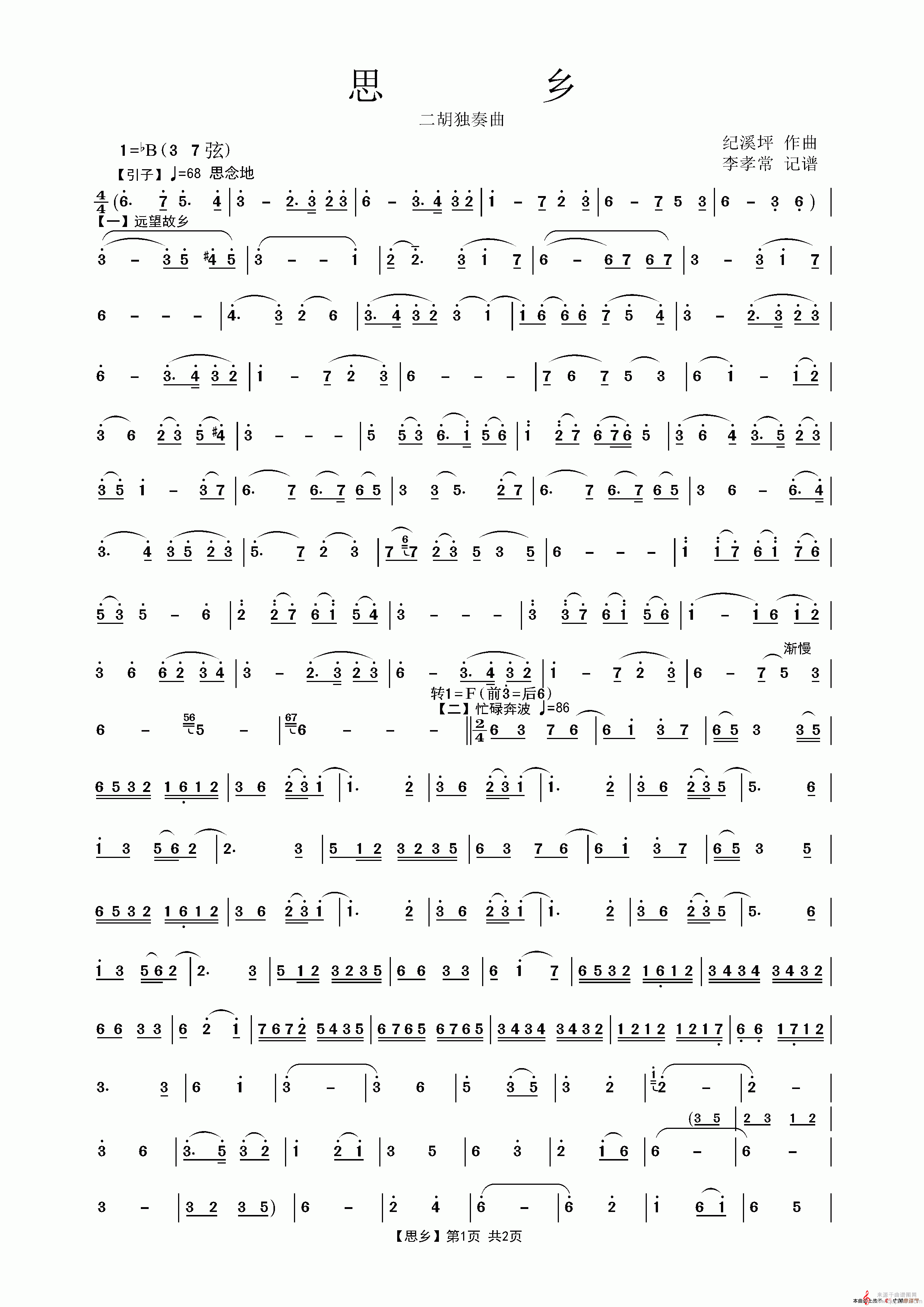 曲谱图网为您提供思乡简谱(二胡独奏曲思乡李孝常记谱)找谱子,就上曲谱图网。