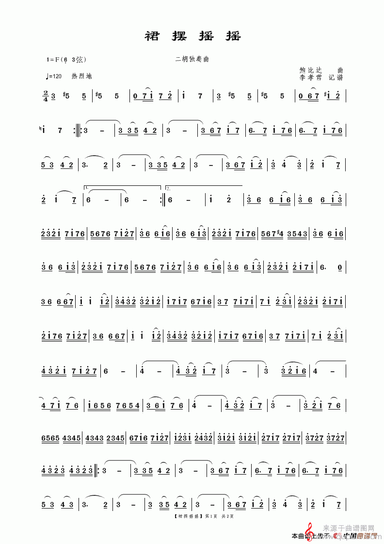 曲谱图网为您提供裙摆摇摇(裙摆摇摇二胡独奏曲)找谱子,就上曲谱图网。