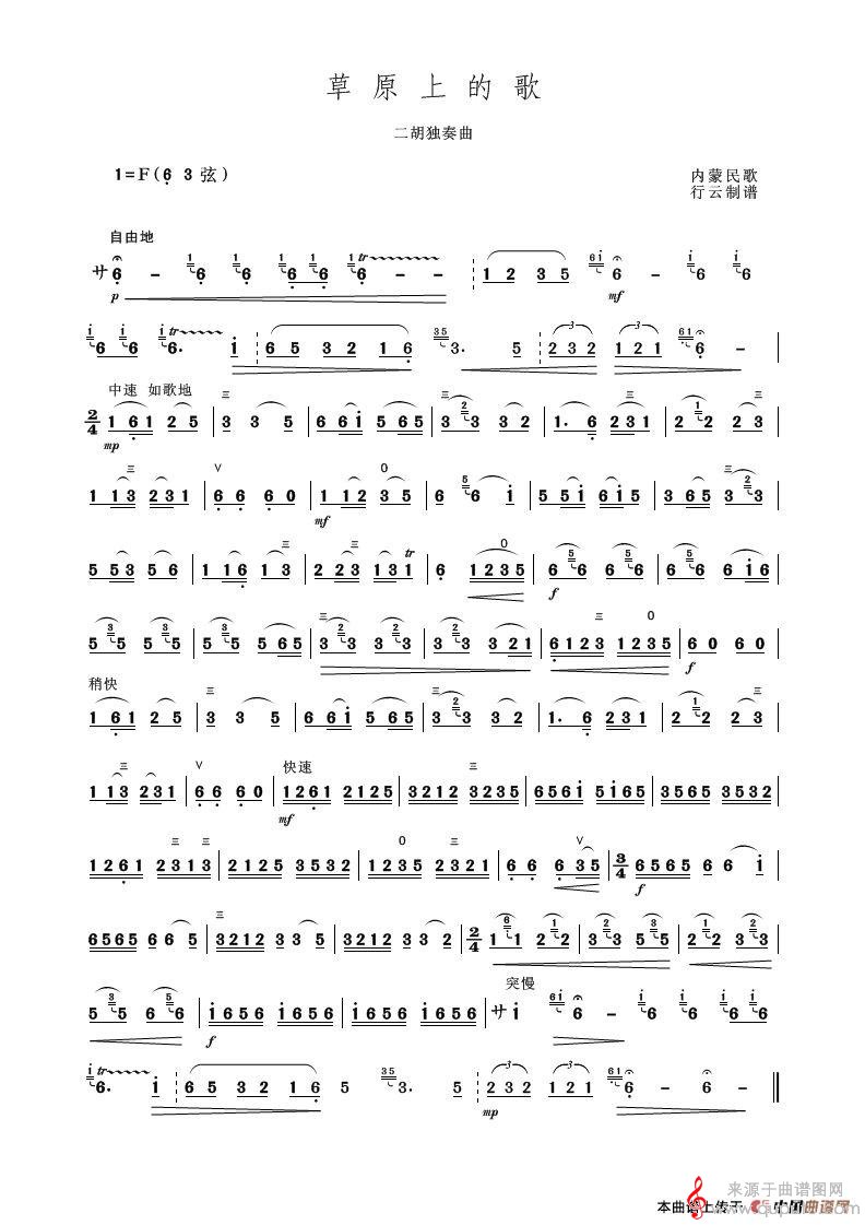 曲谱图网为您提供草原上的歌(内蒙民歌草原上的歌二胡独奏曲简谱)找谱子,就上曲谱图网。