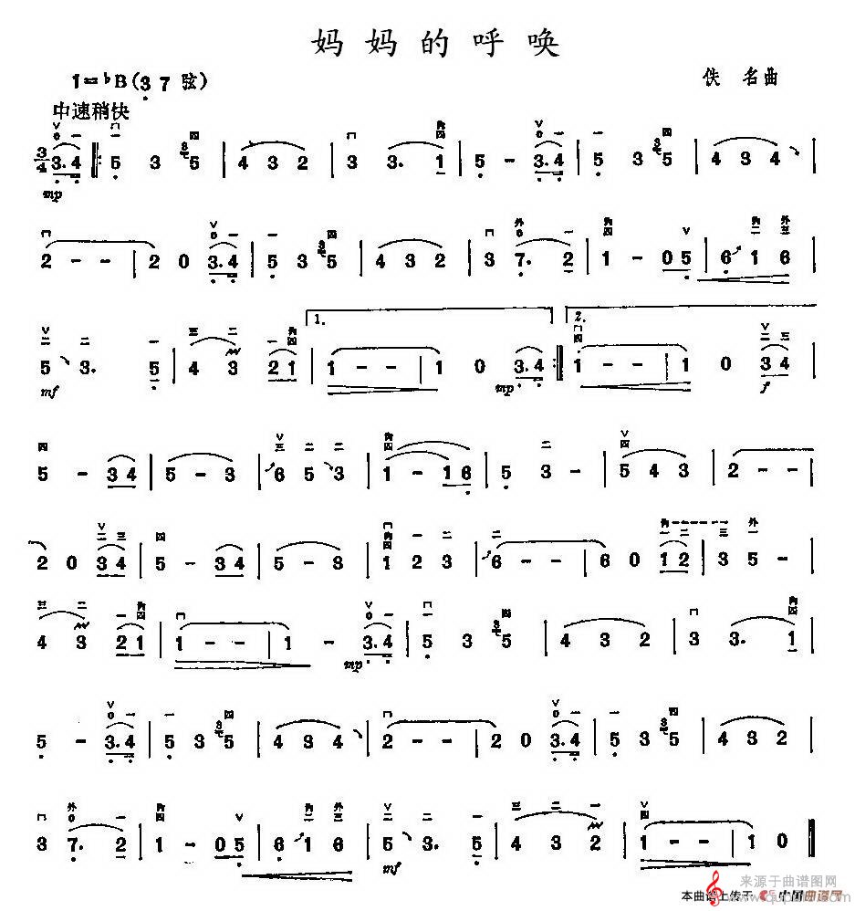 曲谱图网为您提供妈妈的呼唤(妈妈的呼唤原创胡琴谱)找谱子,就上曲谱图网。