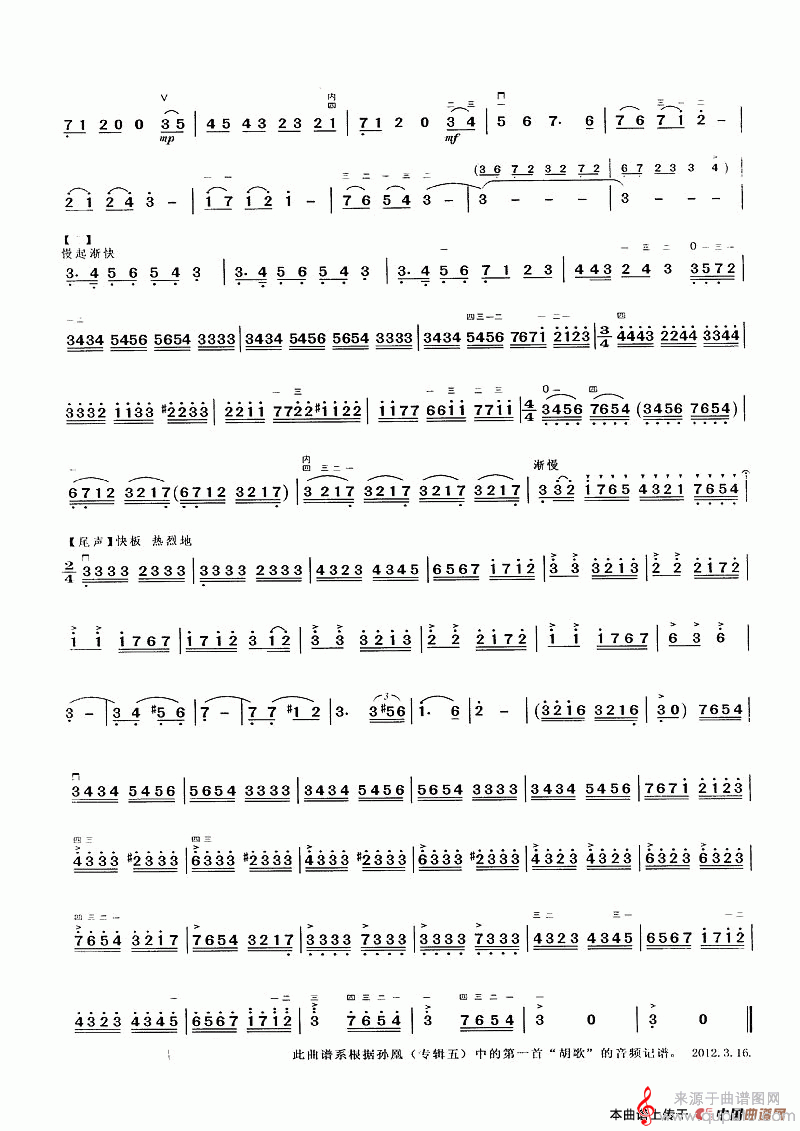 当前位置:曲谱图网器乐曲谱胡琴胡歌(二胡独奏曲胡歌简谱曲谱)