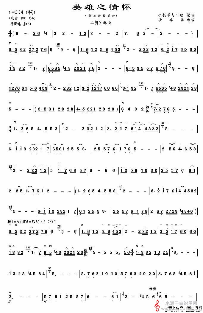 曲谱图网为您提供英雄之情怀二胡独奏曲(新水浒传插曲英雄之情怀简谱曲谱)找谱子,就上曲谱图网。