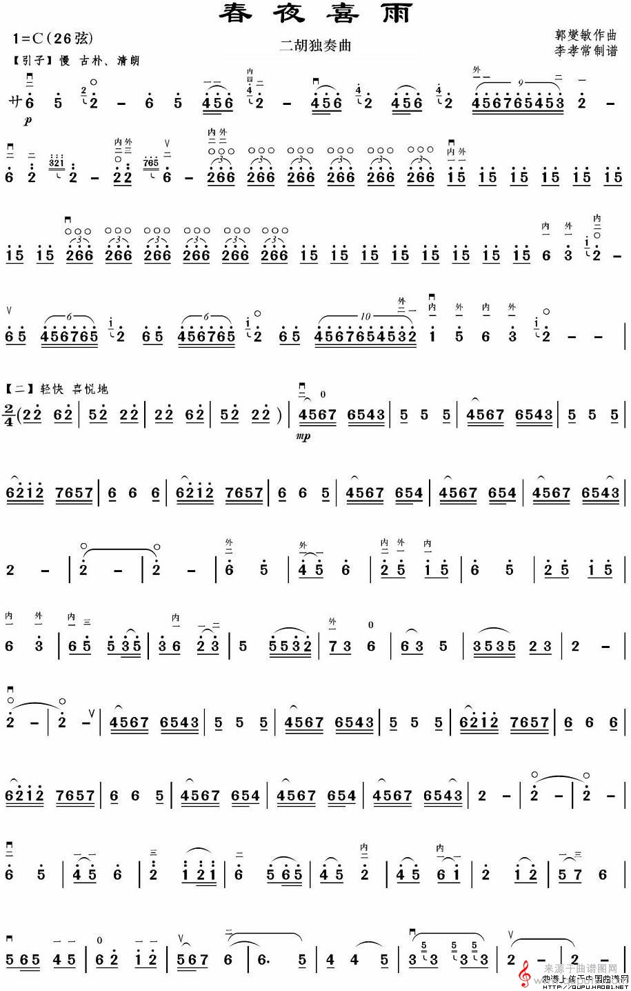 曲谱图网为您提供春夜喜雨(二胡独奏曲春夜喜雨简谱)找谱子,就上曲谱图网。