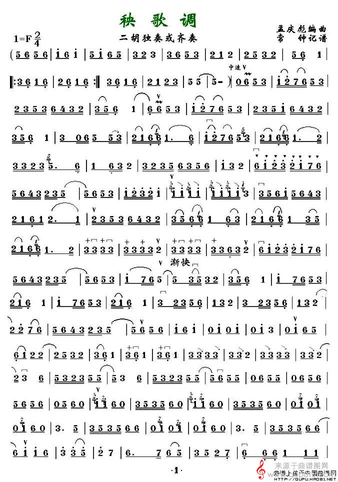 曲谱图网为您提供秧歌调(二胡独奏曲或齐奏秧歌调简谱)找谱子,就上曲谱图网。