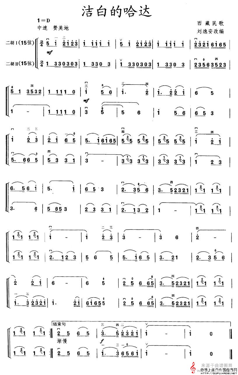 曲谱图网为您提供洁白的哈达(西藏民歌洁白的哈达二胡二重奏曲谱)找谱子,就上曲谱图网。