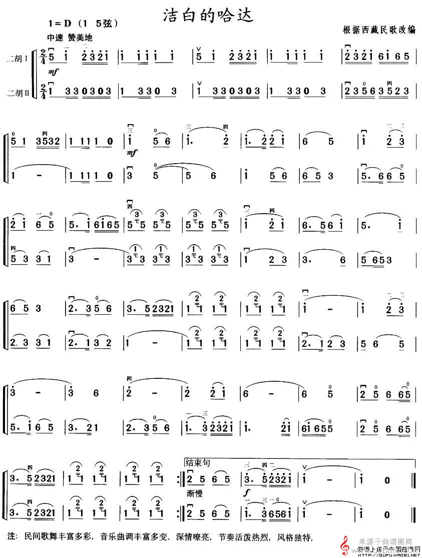 洁白的哈达(根据西藏民歌改编版洁白的哈达二重奏简谱胡琴谱)