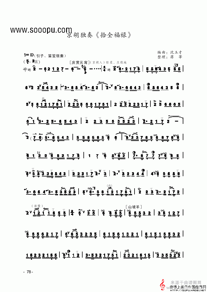 曲谱图网为您提供拾全福禄(沈玉才编曲版拾全福禄京剧曲牌、京胡独奏简谱)找谱子,就上曲谱图网。