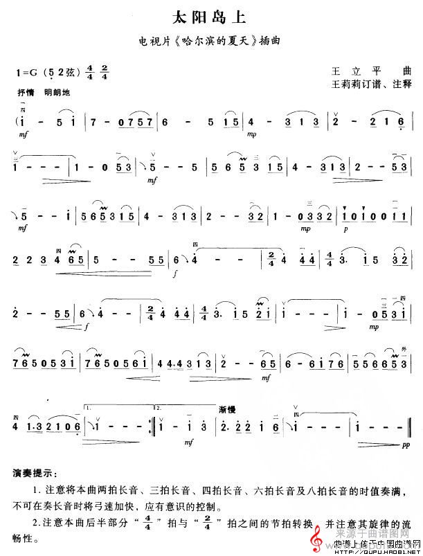 太阳岛上(电视片《哈尔滨的夏天》插曲简谱胡琴谱)