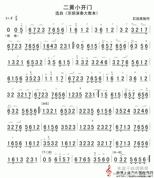 当前位置:曲谱图网器乐曲谱胡琴二黄小开门(选自《京胡大教学》二黄小开门京胡谱简谱)