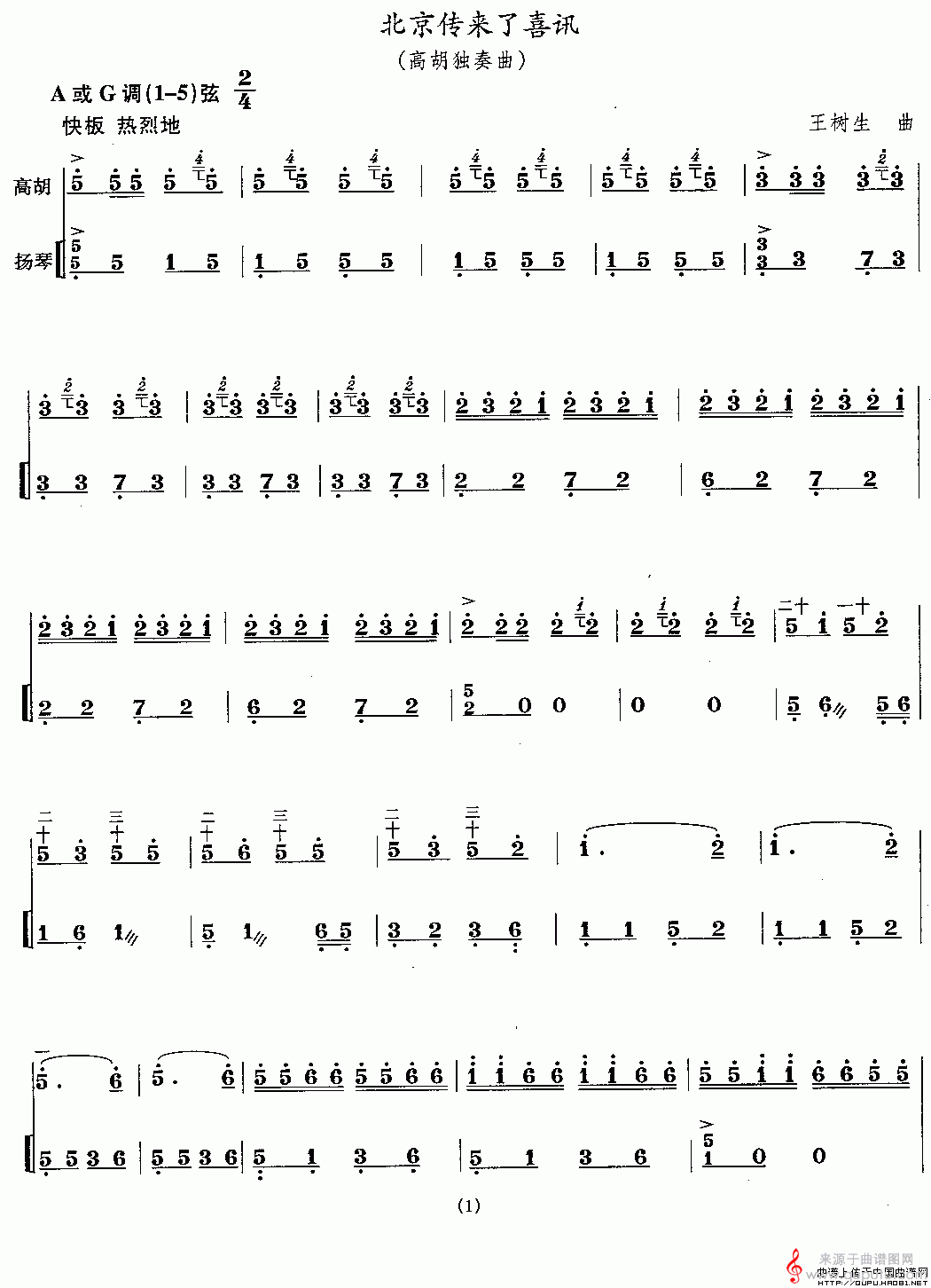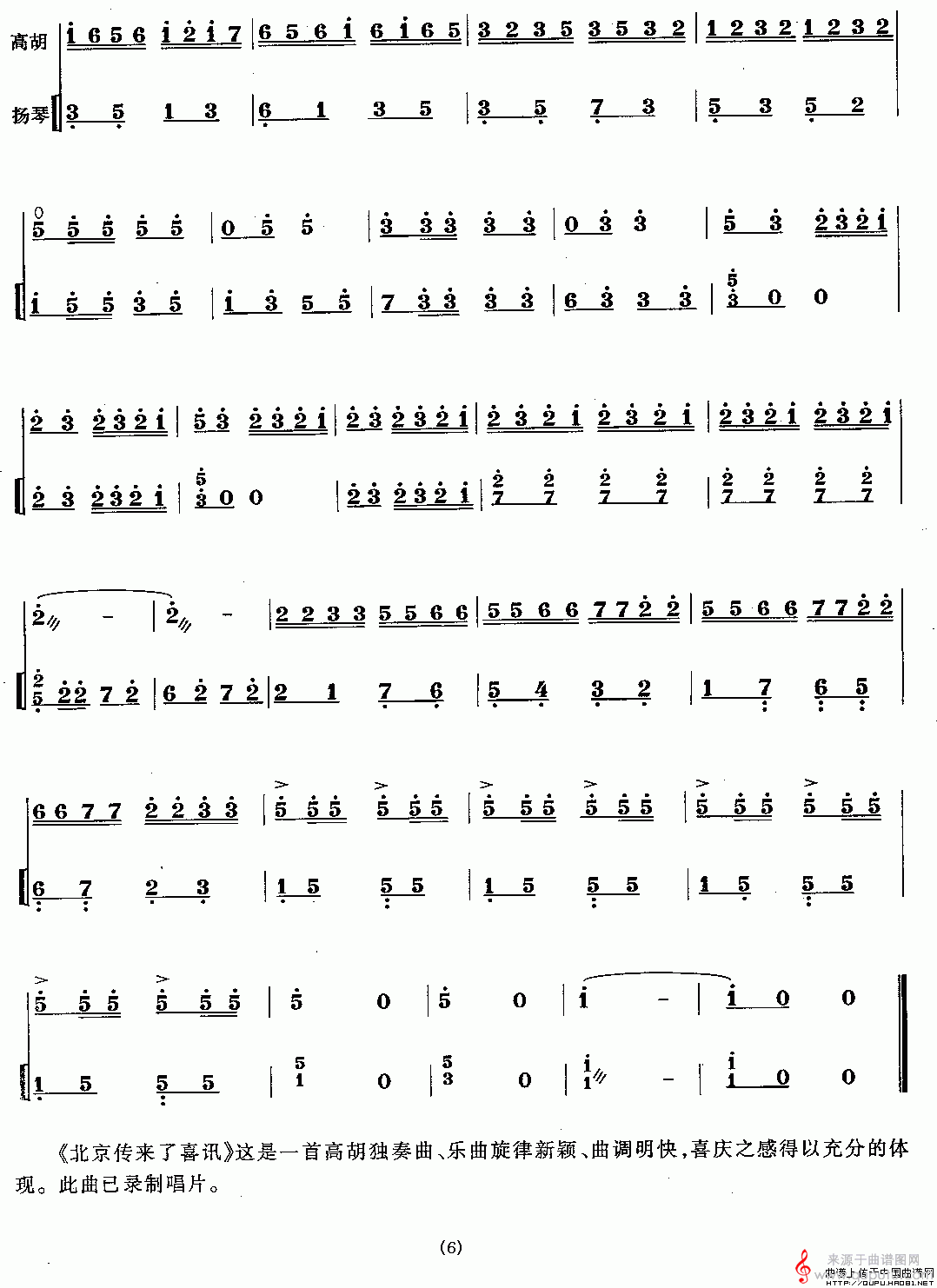 曲谱图网为您提供北京传来了喜讯(高胡独奏、扬琴伴奏简谱教学)找谱子,就上曲谱图网。