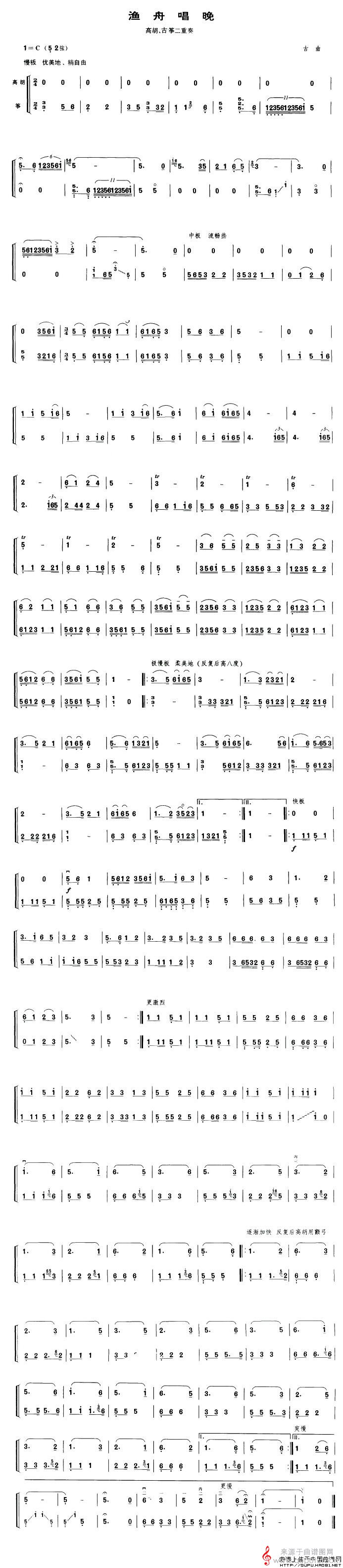 曲谱图网为您提供渔舟唱晚(高胡、古筝二重奏胡琴谱简谱教学)找谱子,就上曲谱图网。