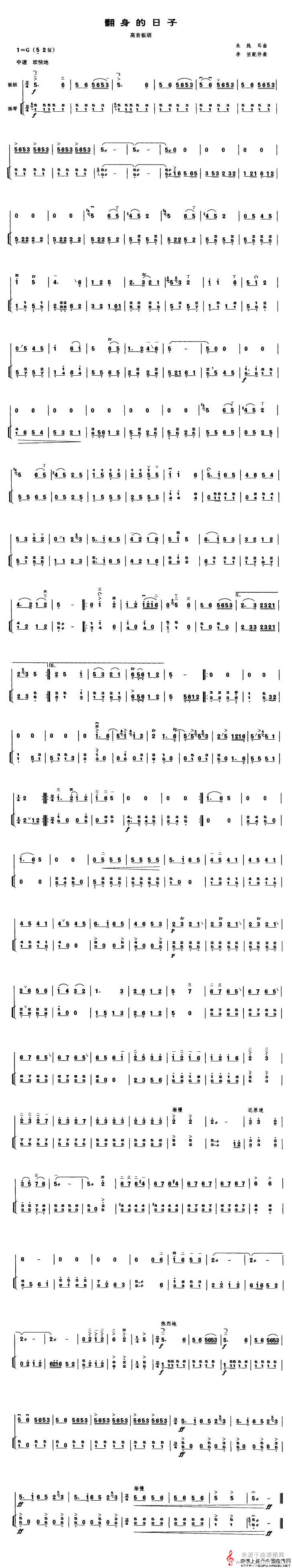 曲谱图网为您提供翻身的日子(高音板胡、扬琴伴奏谱简谱曲谱)找谱子,就上曲谱图网。