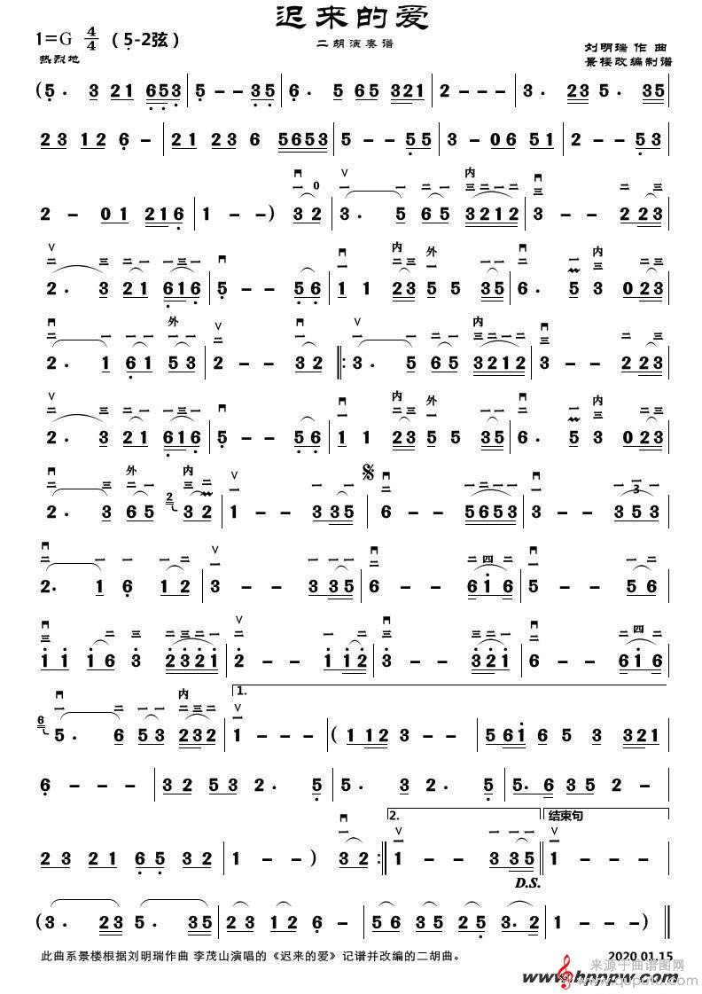 曲谱图网为您提供《迟来的爱》二胡谱找谱子,就上曲谱图网。