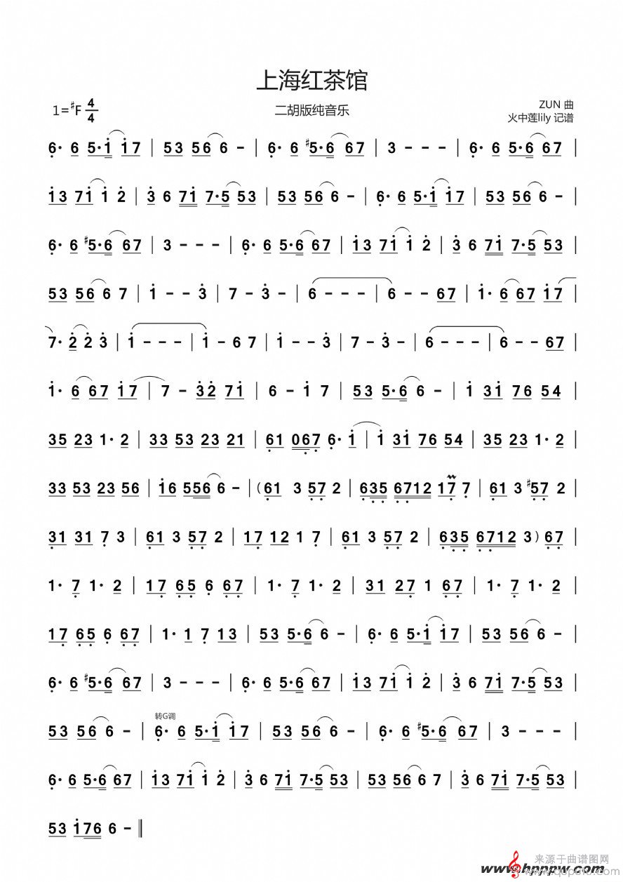 曲谱图网为您提供《上海红茶馆》二胡谱纯音乐演奏版找谱子,就上曲谱图网。