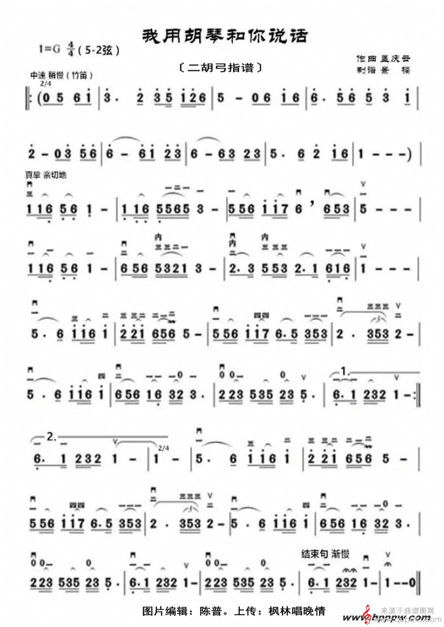曲谱图网为您提供《我用胡琴和你说话》二胡弓指谱找谱子,就上曲谱图网。
