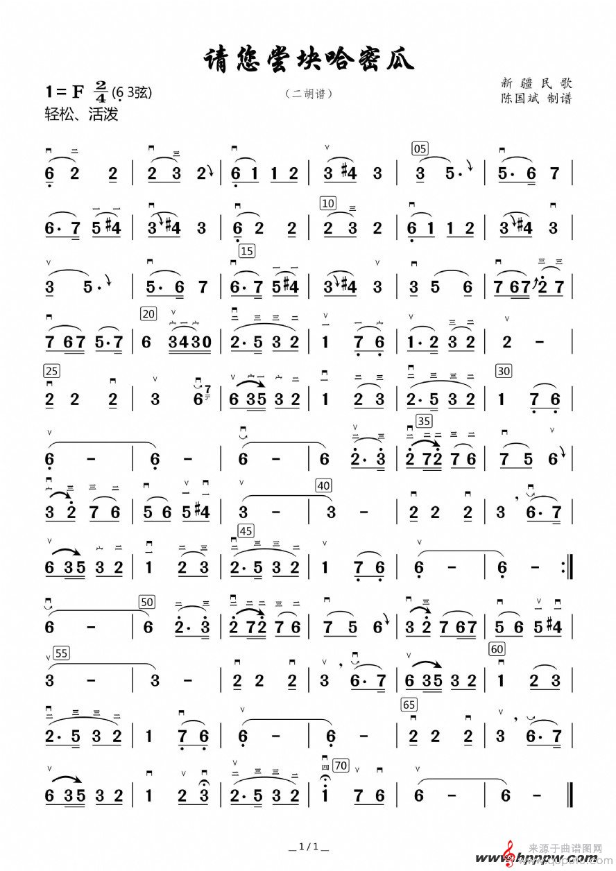 曲谱图网为您提供《请你尝块哈密瓜》二胡谱之新疆民歌找谱子,就上曲谱图网。