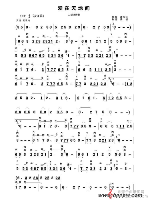 曲谱图网为您提供《爱在天地间》二胡演奏谱之景楼改编版找谱子,就上曲谱图网。