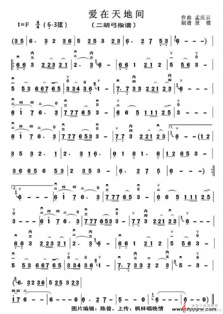 曲谱图网为您提供《爱在天地间》二胡弓指谱找谱子,就上曲谱图网。