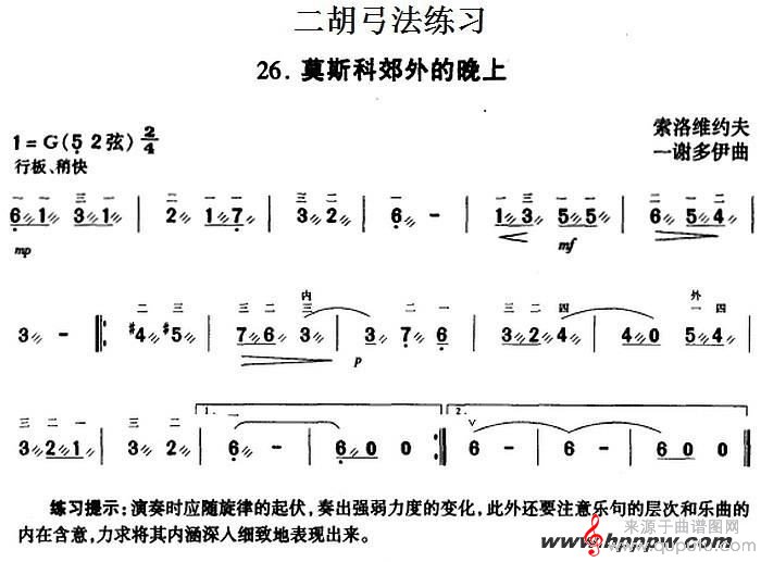 曲谱图网为您提供《二胡弓法练习:莫斯科郊外的晚上》二胡曲谱找谱子,就上曲谱图网。