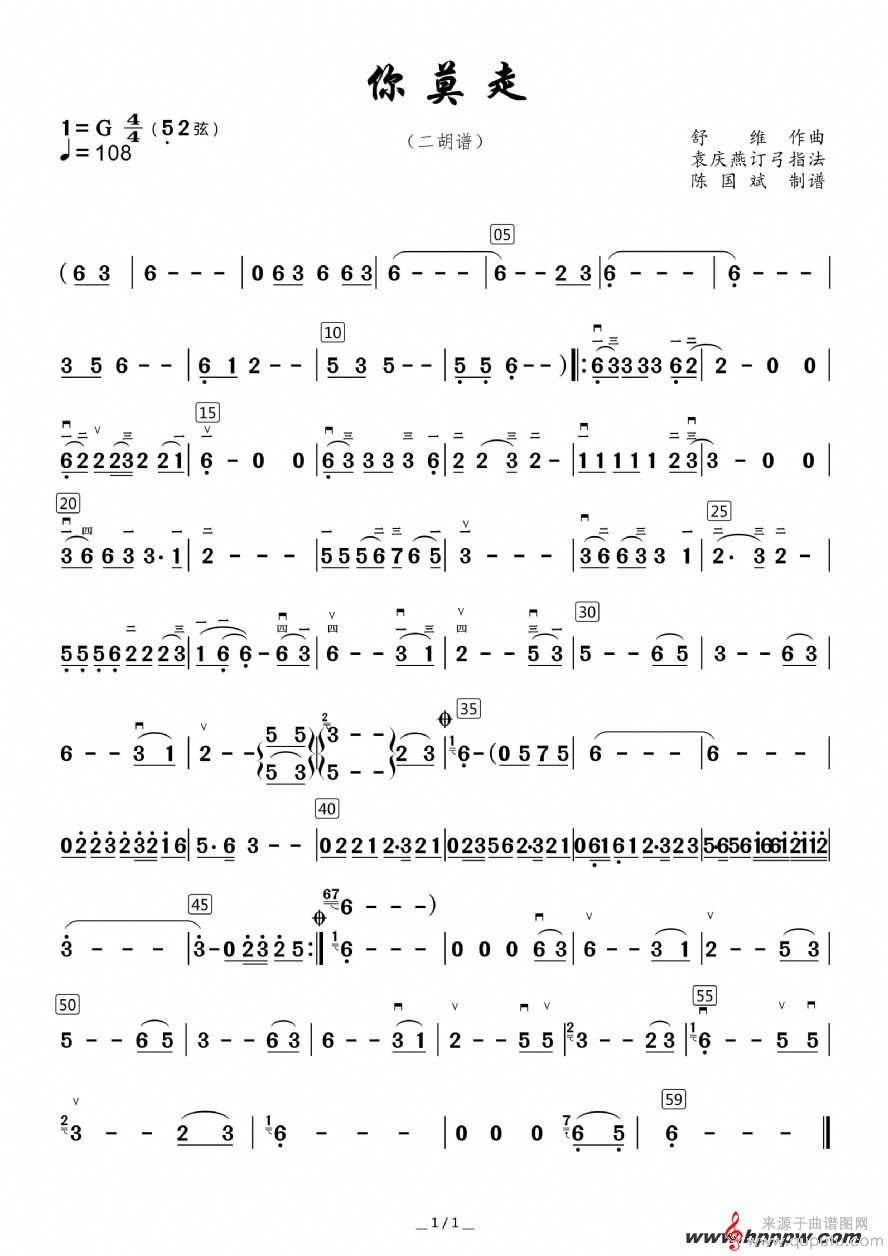 曲谱图网为您提供《你莫走》二胡谱之弓指法版找谱子,就上曲谱图网。