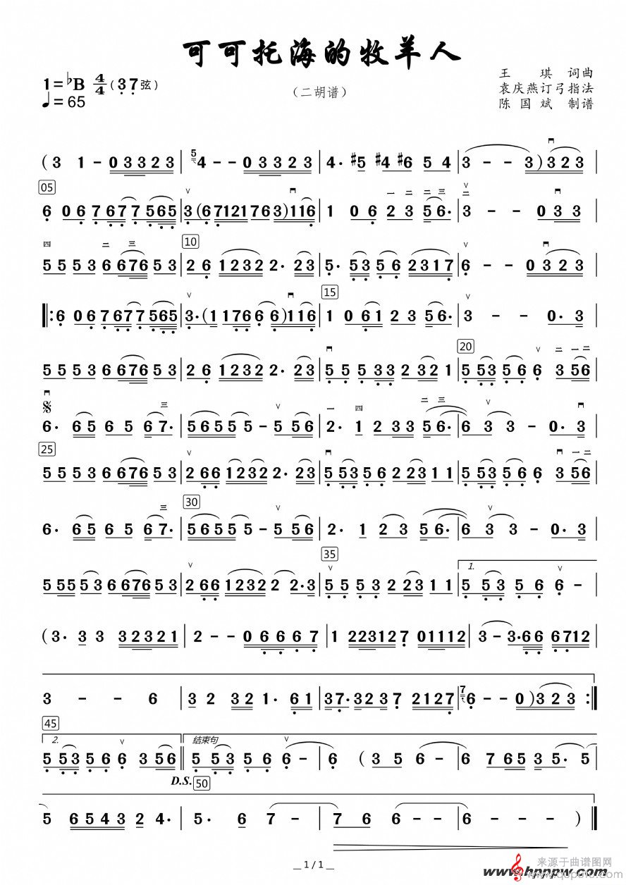 曲谱图网为您提供《可可托海的牧羊人》二胡谱王琪版弓指法找谱子,就上曲谱图网。