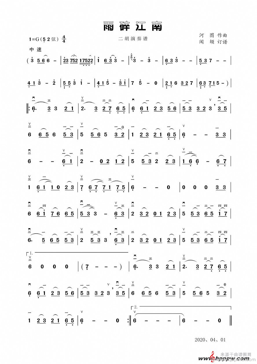曲谱图网为您提供雨碎江南二胡演奏简谱找谱子,就上曲谱图网。