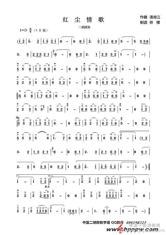 曲谱图网为您提供红尘情歌二胡演奏简谱找谱子,就上曲谱图网。