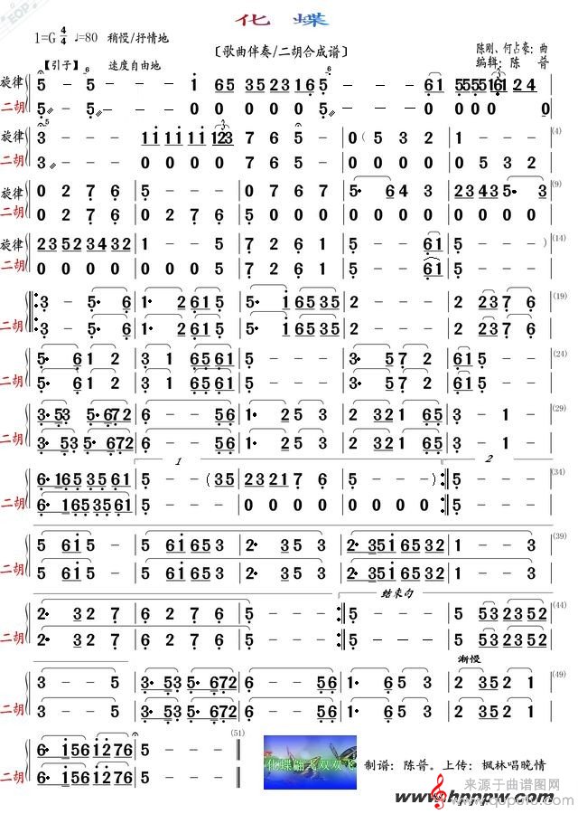 曲谱图网为您提供化蝶歌曲伴奏和二胡合成谱找谱子,就上曲谱图网。