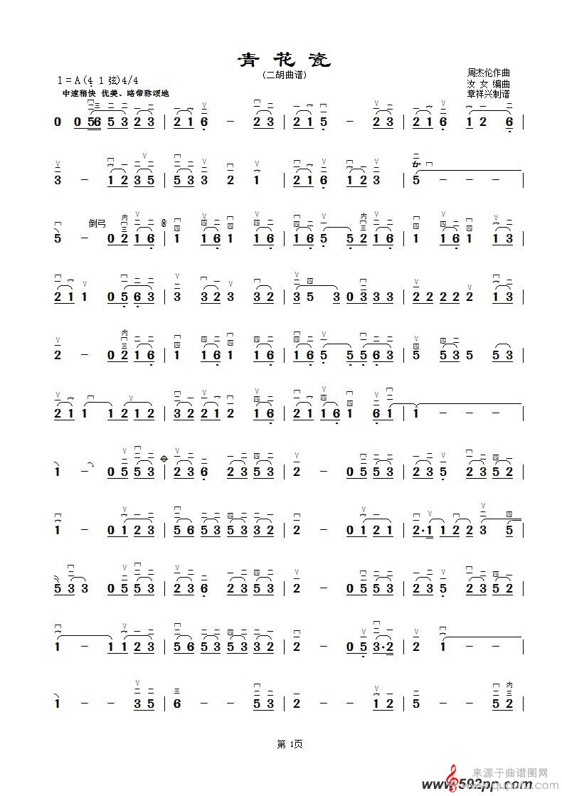 曲谱图网为您提供青花瓷二胡演奏曲谱找谱子,就上曲谱图网。
