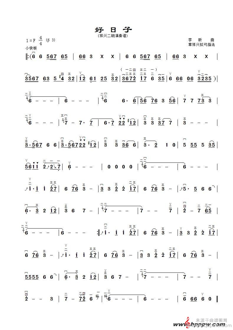 曲谱图网为您提供好日子二胡演奏简谱(弓指法)找谱子,就上曲谱图网。