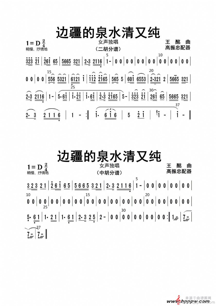 曲谱图网为您提供边疆的泉水清又纯二胡独奏简谱找谱子,就上曲谱图网。