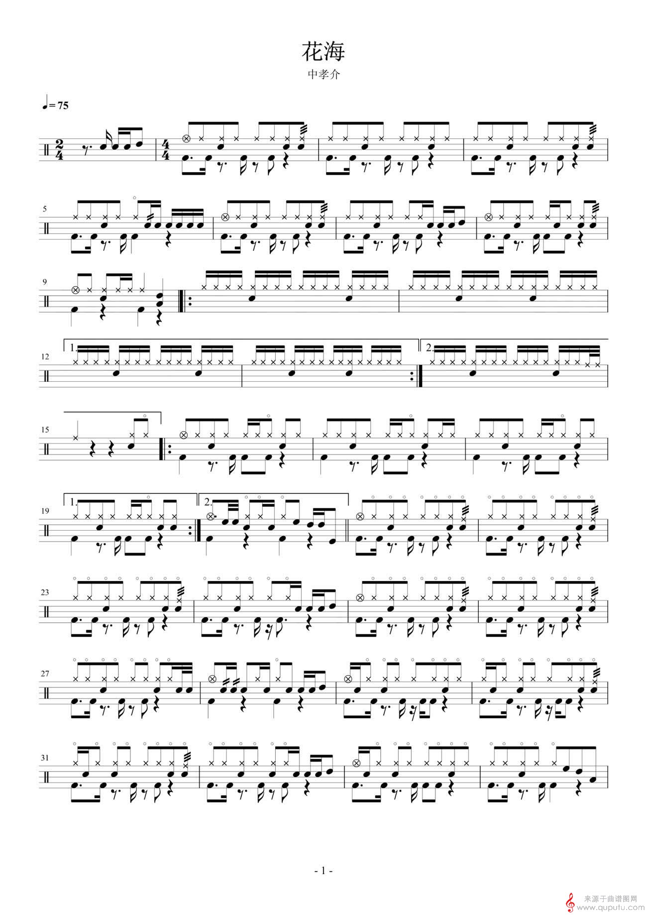 曲谱图网为您提供花海(架子鼓教学简单完整鼓谱)找谱子,就上曲谱图网。
