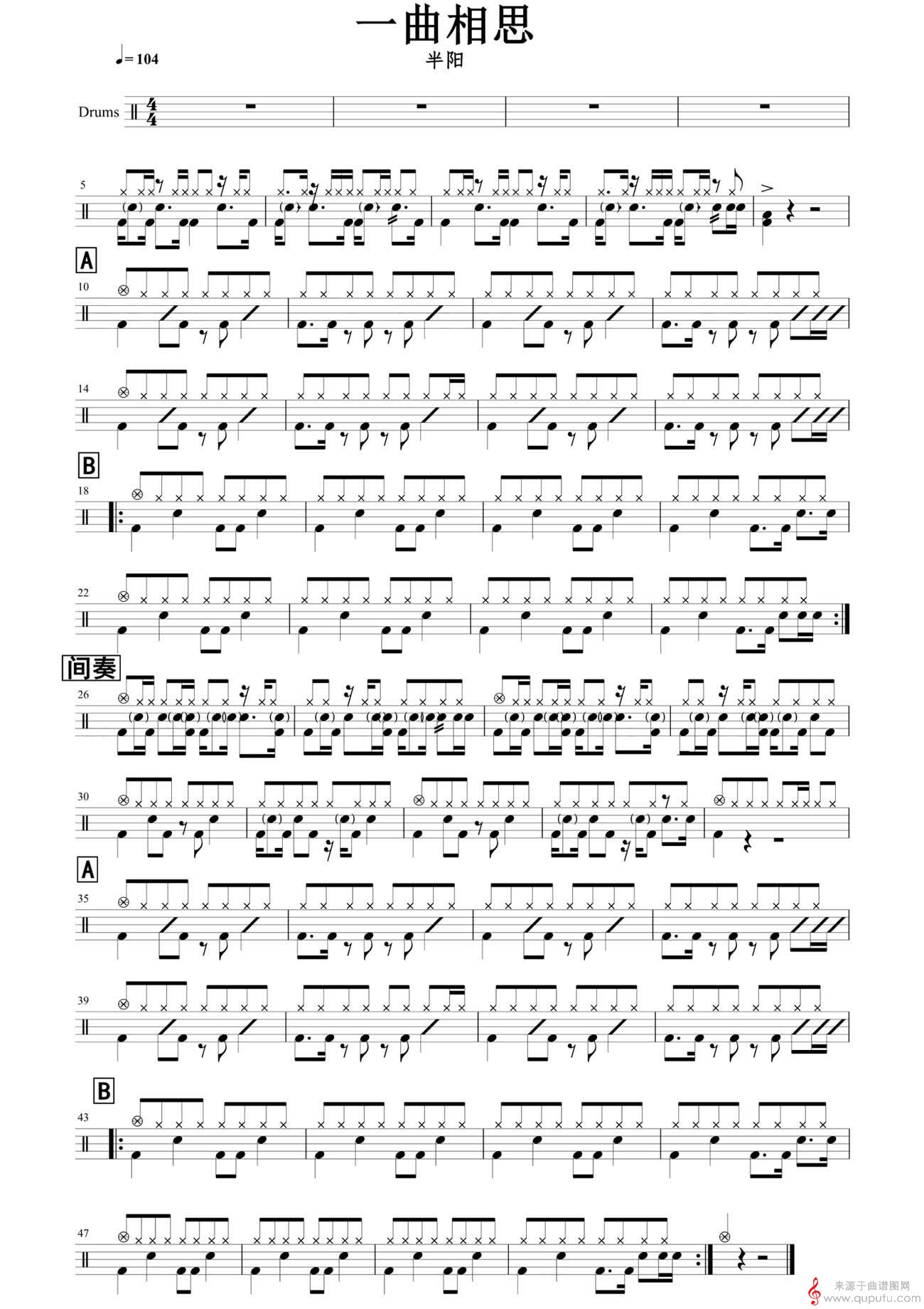 曲谱图网为您提供一曲相思(架子鼓教学鼓谱)找谱子,就上曲谱图网。