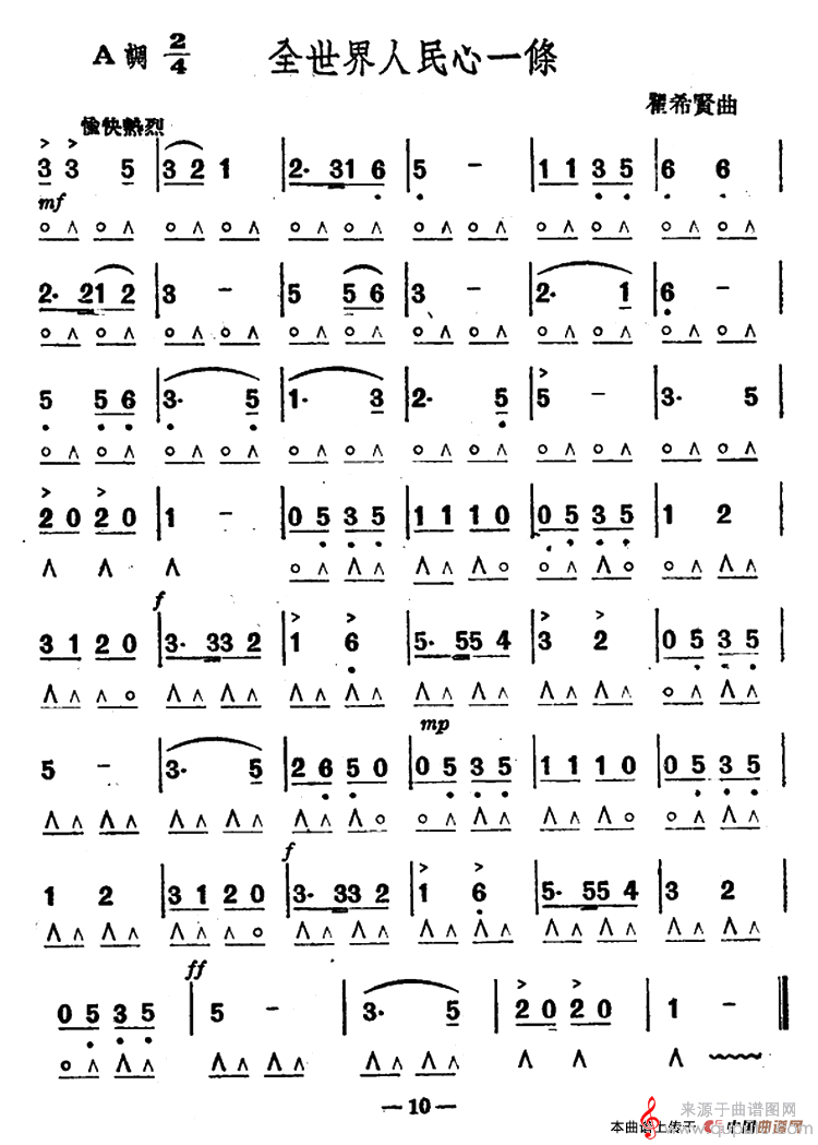 全世界人民心一条(口琴乐曲简谱)