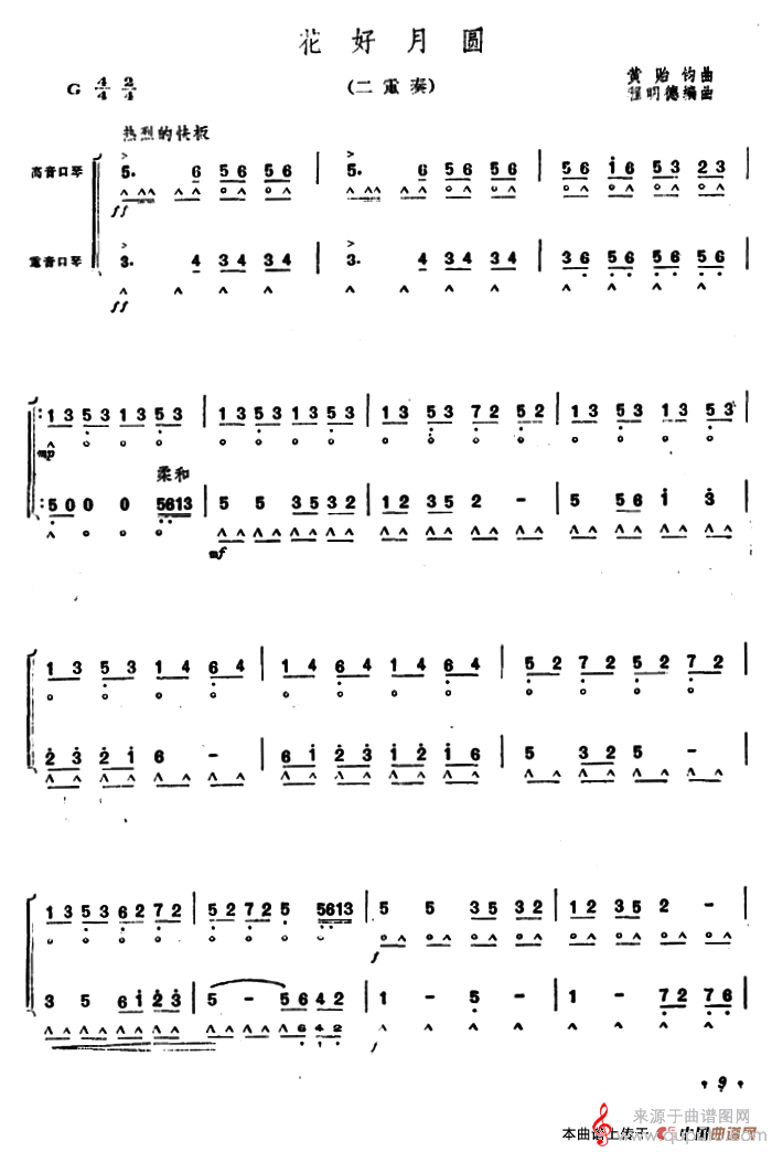 曲谱图网为您提供花好月圆(口琴曲二重奏四重奏简谱乐谱)找谱子,就上曲谱图网。
