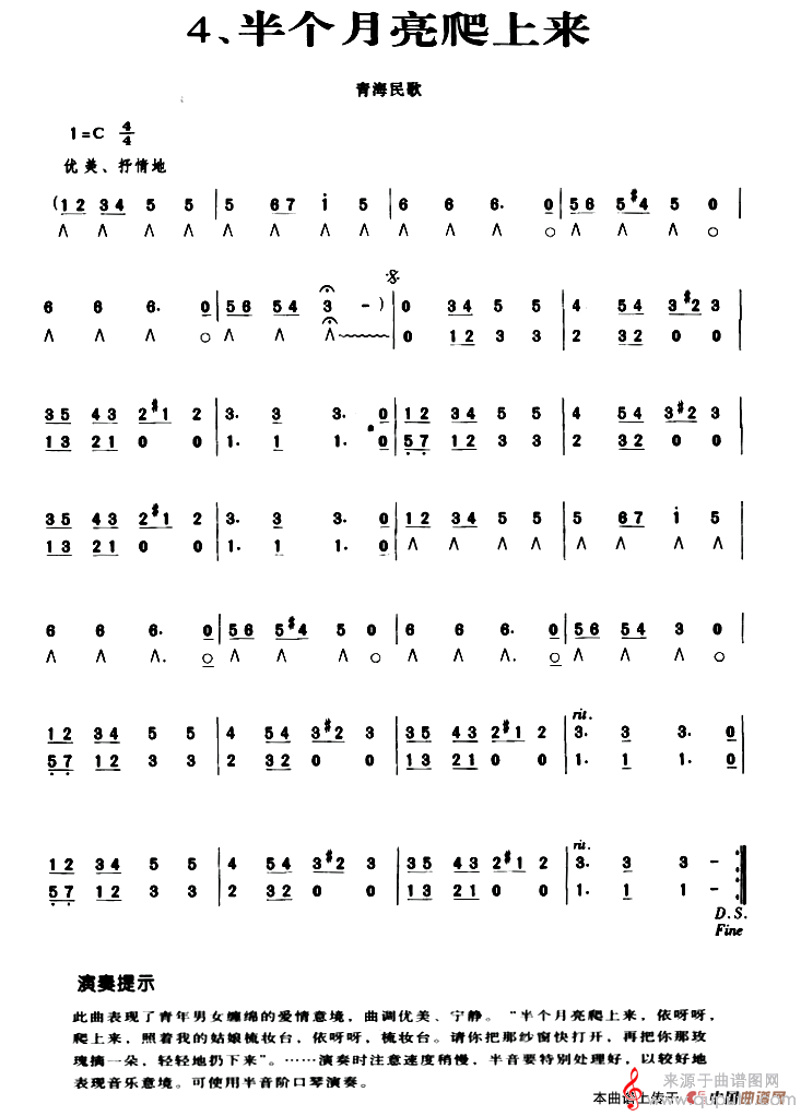 曲谱图网为您提供半个月亮爬上来(口琴曲独奏曲谱演秦提示版)找谱子,就上曲谱图网。