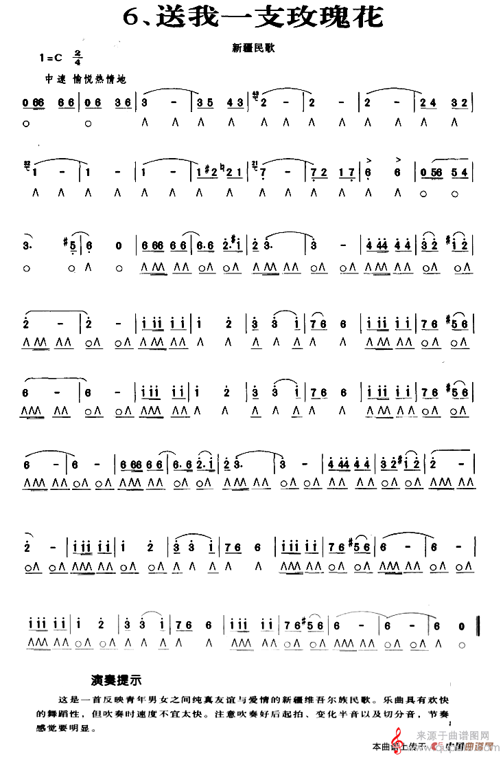 曲谱图网为您提供送我一支玫瑰花(新疆民歌口琴曲演奏简谱)找谱子,就上曲谱图网。