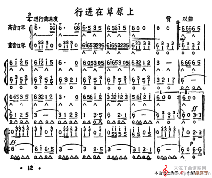 曲谱图网为您提供行进在草原上(口琴曲二重奏演奏简谱)找谱子,就上曲谱图网。