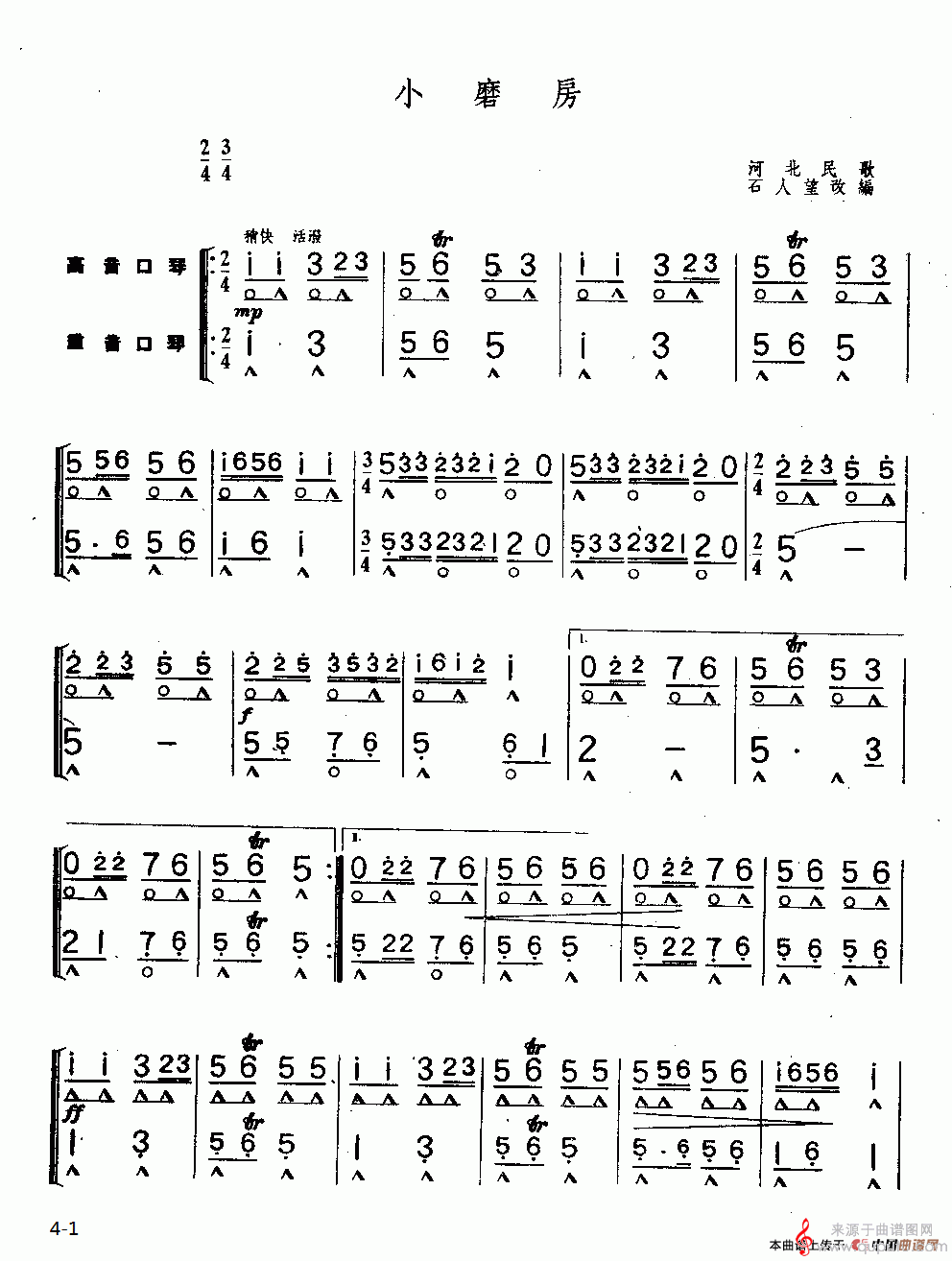 小磨房(口琴曲二重奏简谱)