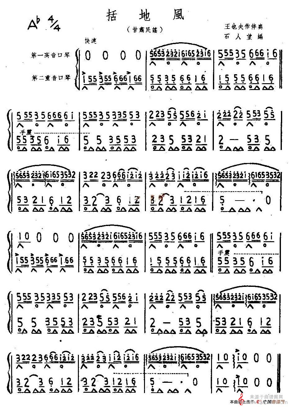 曲谱图网为您提供括地风(口琴曲二重奏教学简谱)找谱子,就上曲谱图网。