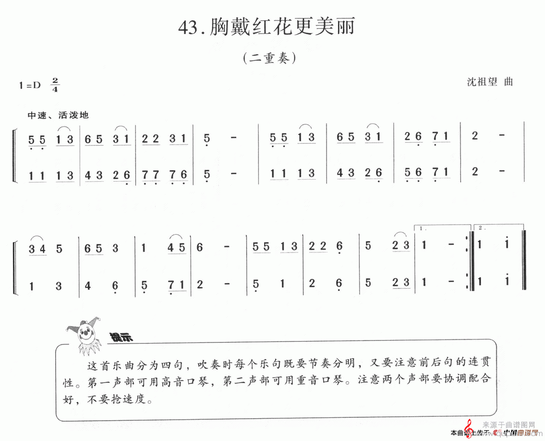 曲谱图网为您提供胸戴红花更美丽(口琴二重奏伴奏简谱)找谱子,就上曲谱图网。