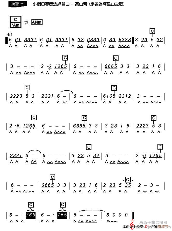 曲谱图网为您提供高山青(口琴奏法练习曲)找谱子,就上曲谱图网。